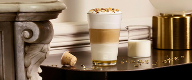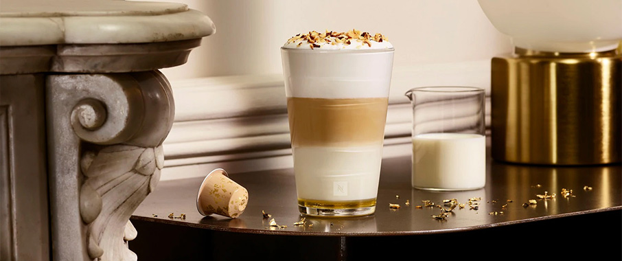 - Pour the hot milk foam in the glass, and brew 40ml of Infiniment Gourmand on the top.