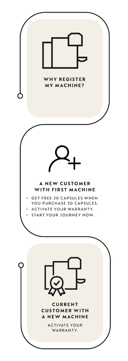 By fulfilling this form and, registering your machine, you will be entitle to your Welcome Gift(20 Nespresso coffee capsules free when you buy 30 Nespresso coffee capsules) by receiving the voucher. Also, by doing this, you will be activating your customer account that will allow you to access future benefits and activate your 2 year Warranty on your Nespresso Machine.