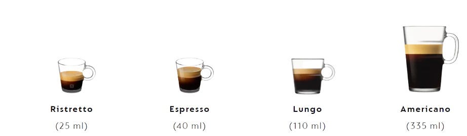 Espresso 40 ml, Ristretto 25 ml, Double Espresso 80 ml, Gran Lungo 150 ml